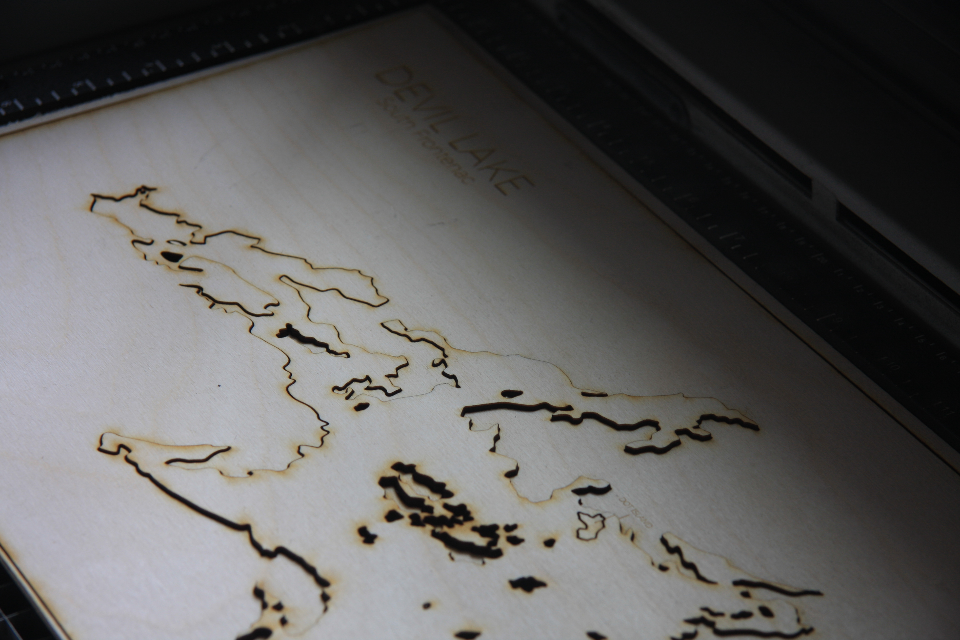 Commissioned Piece. Laser-cut topography assembly of Devil Lake, South Frontenac, Canada