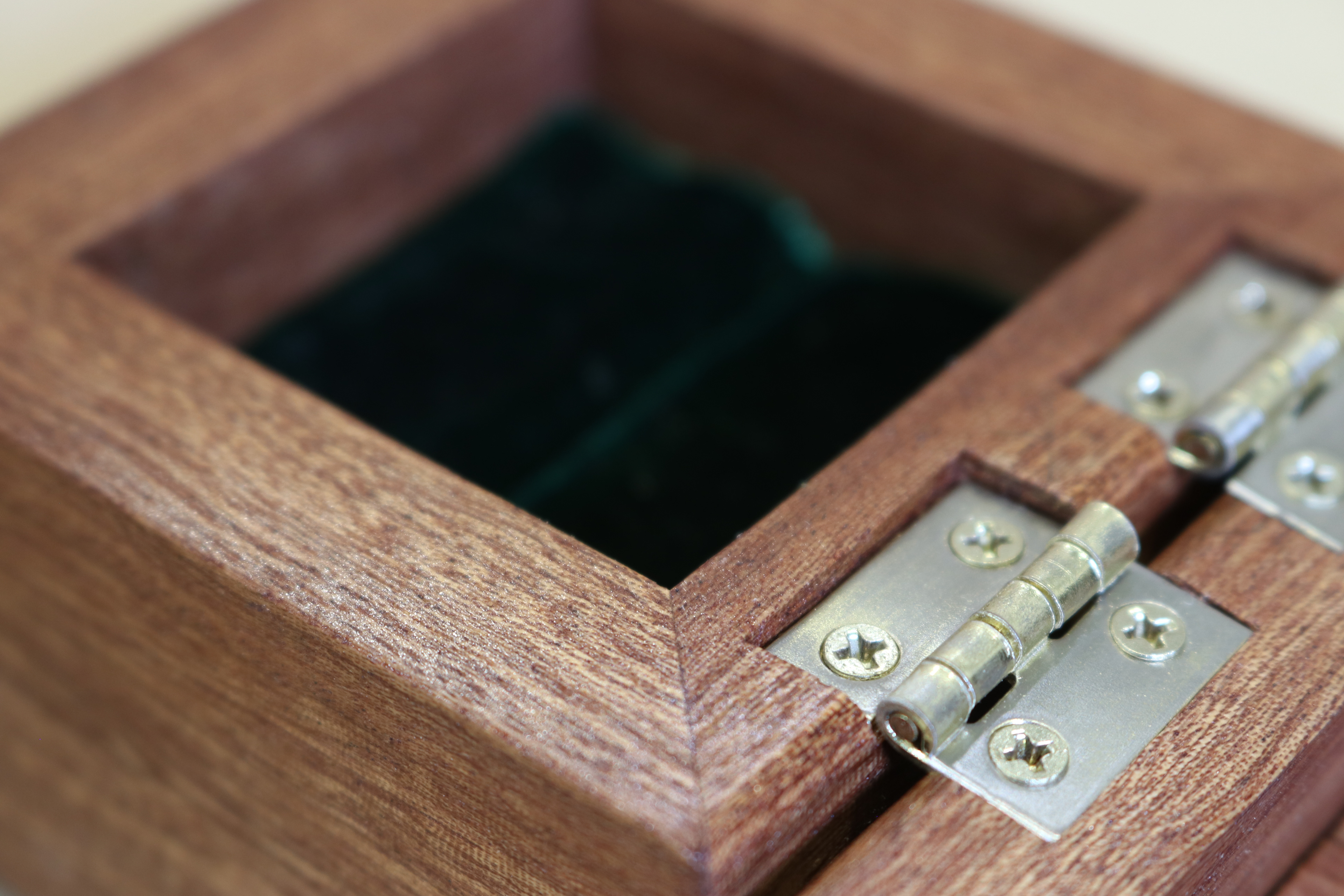 Commissioned box. Sapele Mahogany, Maple splines, Brass hardware, velvet ring slot